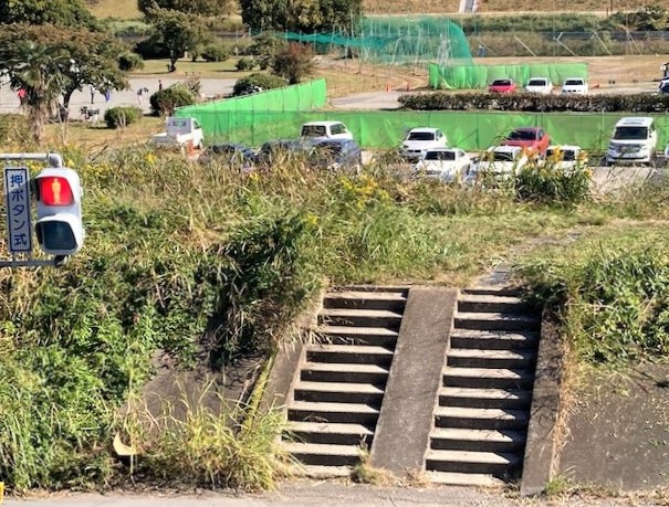 丸子橋ゴルフ練習場手前の多摩川の土手です。写真左側をごらんください。草が1m近く伸びていましたが、本日作業担当の方がカット!